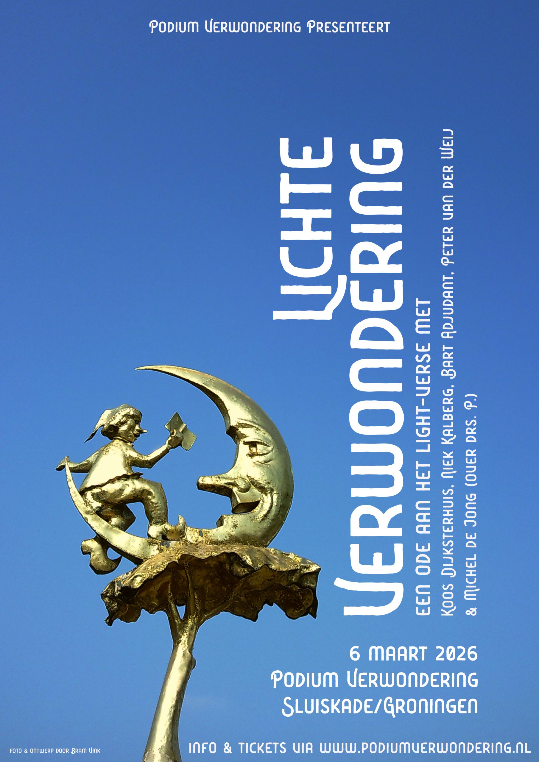 Podium Verwondering Sluiskade, GroningenLICHTE VERWONDERING Een avond vol taalplezier, dat is de belofte op 6 maart bij ‘Podium Verwondering’! Wat kunt u verwachten? Veel humoristische, vormvaste en rijmende poëzie. Sonnetten, snelsonnetten, ollekebollekes, Trijntje Fops, en nog veel meer. Naast de Groninger plezierdichters Koos Dijksterhuis, Niek Kalberg en Bart Adjudant zal Michèl de Jong, biograaf van de legendarische Heinz Lees meer over“Lichte Verwondering” een ode aan het light-verse[…]